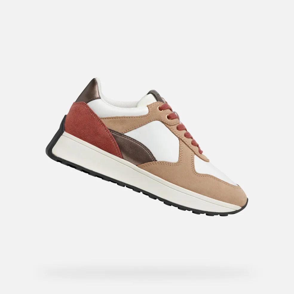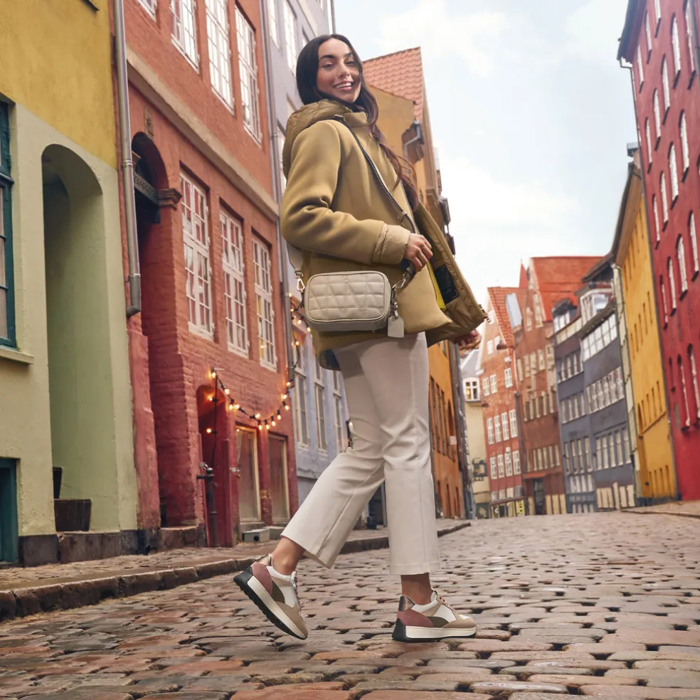 Sneaker donna dal design di ispirazione retro running, che offre comfort e traspirabilità a ogni passo. La sua particolare tomaia gioca con i contrasti in un mix di nappa e scamosciato, ed è qui proposta in bianco e beige rosato. Femminile e grintosa al punto giusto, Amabel è pensata per valorizzare i look casual con un tocco active.