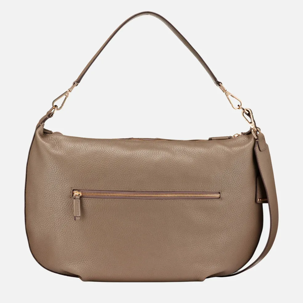Borsa maxi hobo donna dall’estetica intramontabile, immancabile nel guardaroba cittadino. Realizzata in pelle bottalata è qui proposta in una raffinata variante color taupe, perfetta per completare gli abbinamenti casual-chic. Grazie alla sua pratica tracolla removibile, Aurelyi diventa all’occorrenza una capiente borsa, ideale per passeggiare a mani libere.Indosso a mano, a spalla o a tracolla.Chiusura con zip in metallo.Manico removibile.Tracolla removibile inclusa all’interno.Una tasca posteriore con zip.Due tasche interne.Portachiavi removibile con targhetta in pelle.Accessori metallici con finitura oro.Dimensioni: L 44 cm x W 2 cm x H 32,5 cm.