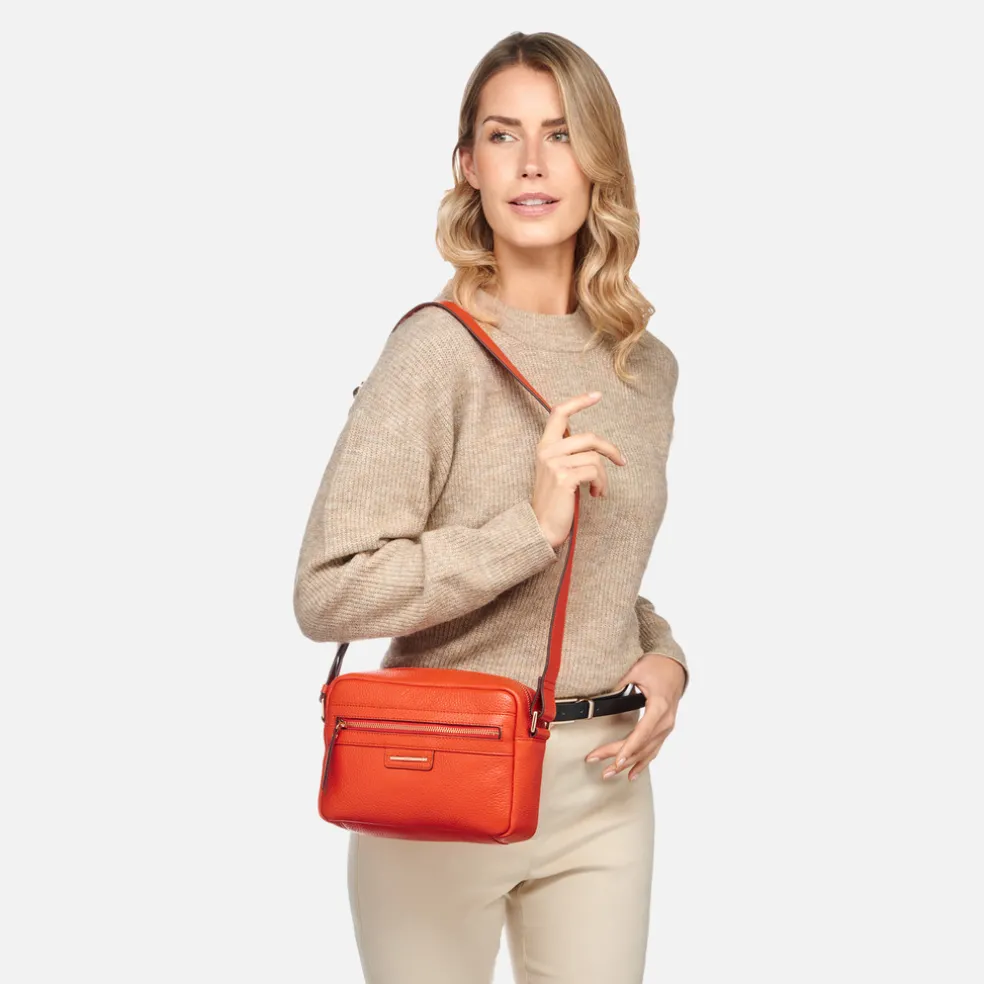 Borsa donna a tracolla, compatta ma capiente, perfetta sia per la città che per le gite fuori porta. Caratterizzata da un design pulito e curato nei dettagli, è realizzata in morbida pelle bottalata ed è qui proposta in un’alternativa tonalità arancione. Dotata di una tracolla regolabile e di due pratiche tasche esterne, Blandine è una comoda cross-body pensata per le esigenze della vita moderna.Indosso a tracolla.Chiusura con zip in metallo.Tracolla regolabile.Tasca frontale e posteriore con zip in metallo.Due tasche interne di cui una con zip.Accessori metallici con finitura oro.Dimensioni: L 25 cm x W 8 cm x H 16 cm.