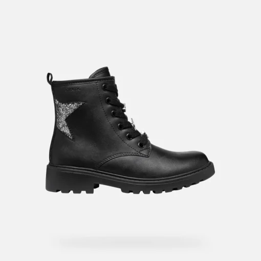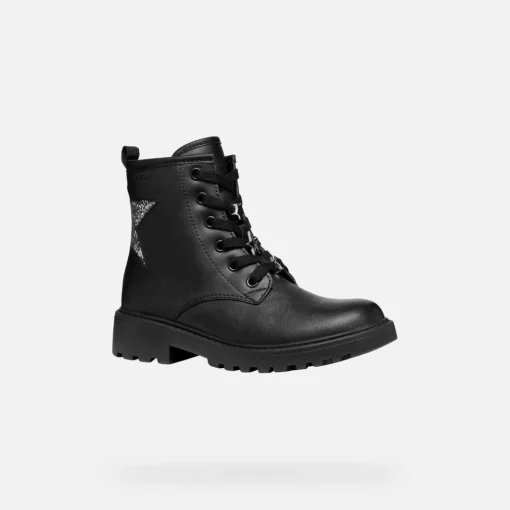 Stivaletto stringato bambina confortevole e traspirante, dall’appeal urban e dal design grintoso. Qui proposto in nero, con brillanti dettagli argento scuro, Casey è un modello perfetto per dare un tocco glam ad ogni look. Realizzato in materiale effetto pelle e tessuto glitterato, sfoggia un’applicazione a forma di stella.