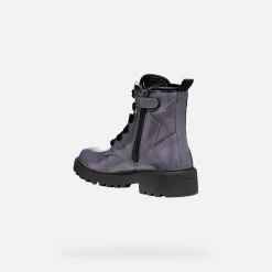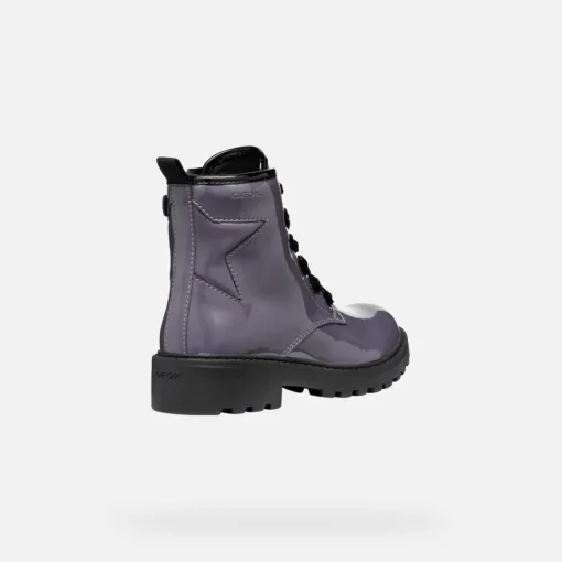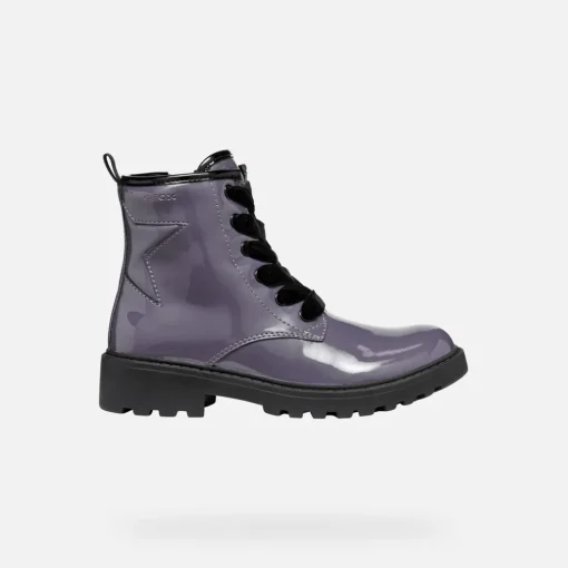 Stivaletto stringato bambina dall’appeal glam, traspirante e confortevole. Qui proposto in un affascinante tonalità viola scuro, Casey vanta un design grintoso ispirato ai classici anfibi. Femminile e perfetto per impreziosire ogni look quotidiano, è realizzato in materiale effetto vernice.