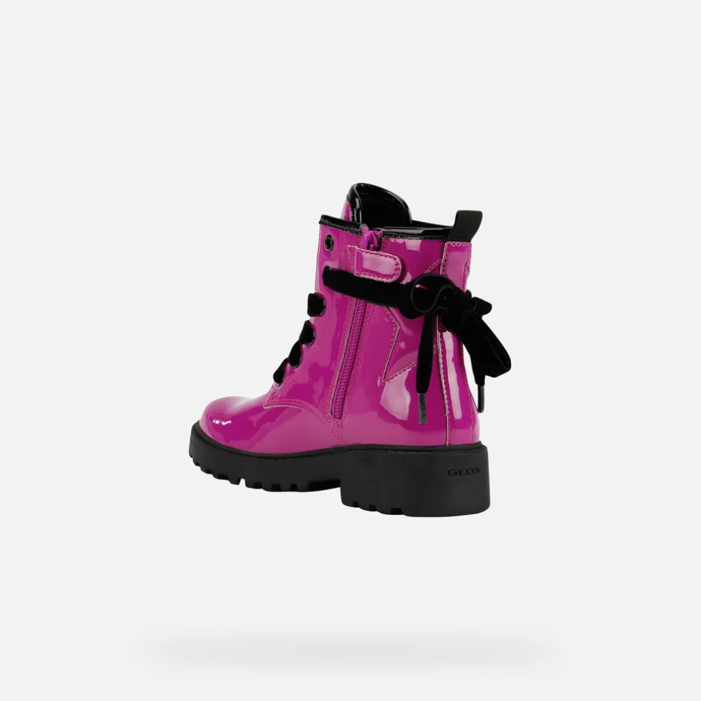 Stivaletto stringato bambina dall’appeal glam, traspirante e confortevole. Qui proposto in una vivace tonalità ciclamino, Casey vanta un design grintoso ispirato ai classici anfibi. Femminile e perfetto per impreziosire ogni look quotidiano, è realizzato in materiale effetto vernice.