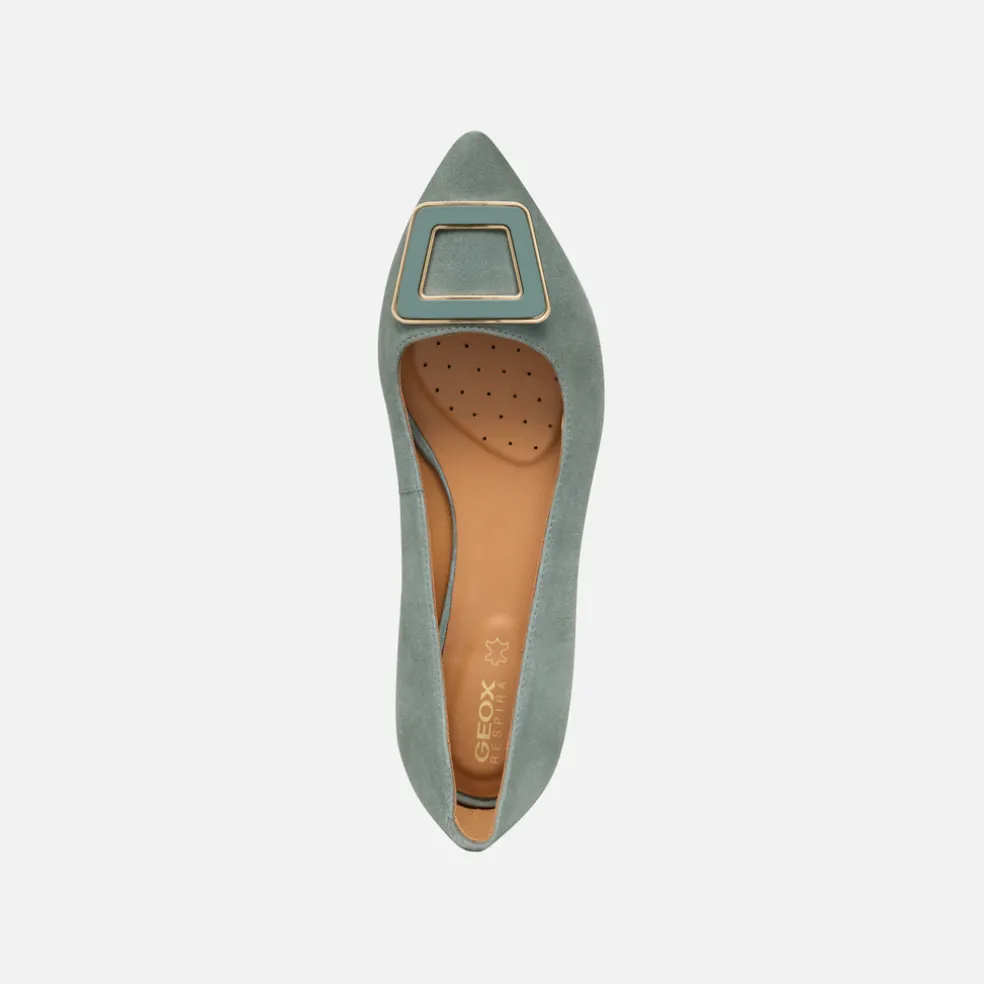 Raffinata ballerina donna a punta con comodo tacco basso, che offre leggerezza e traspirabilità. La sua tomaia in morbido camoscio, qui proposta in una delicata sfumatura verde salvia, è arricchita da un dettaglio gioiello. Con la sua attitudine cittadina ed ultra femminile, Charyssa è ideale dall’ufficio all’aperitivo.