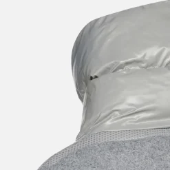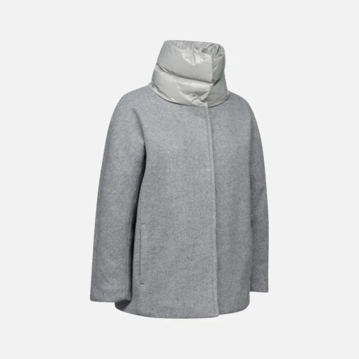 Cappotto corto donna antivento con chiusura nascosta, dal look urban e moderno. Qui proposto in una versatile versione grigio chiaro mélange, è proposto in tessuto effetto lana arricchito da dettagli in nylon lucido sul collo ampio e avvolgente. Ideale per gli outfit cittadini, Diamanta vanta un interno trapuntato e imbottito in ovatta riciclata EcologicWARM.