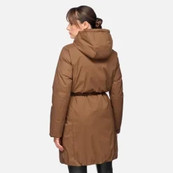 Giacca lunga donna imbottita, moderna e funzionale, dal look casual-chic. Qui declinata in un’accattivante versione marrone bruciato, Eleana è realizzata in morbido poliestere dall’aspetto opaco con fodera dell’interno capo trapuntata e in contrasto colore. Dotata di cappuccio staccabile, tre comode tasche interne e coulisse che enfatizza il punto vita, è un capospalla ideale sia in città che in viaggio.