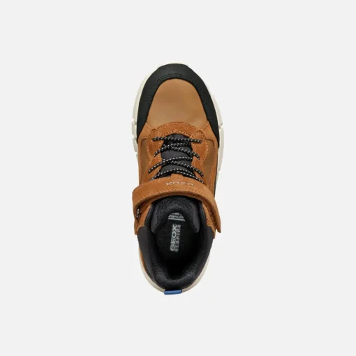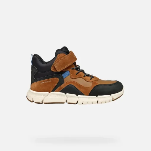 Stivaletto bambino ammortizzato e impermeabile, dal dna sporty-casual. Qui proposto in una combinazione di marrone chiaro e nero, Flexyper ABX presenta una tomaia in materiale effetto pelle e scamosciato. Perfetto sia per le avventure all’aria aperta che per le uscite quotidiane, vanta una suola leggera e flessibile dall’ottima aderenza.