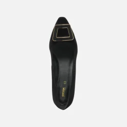 Décolleté donna con tacco basso sottile dal dna cittadino, che offre leggerezza e traspirabilità. In questa elegante variante nera, è realizzata in morbido camoscio e impreziosita da un raffinato dettaglio gioiello. Giselda R completa i look da ufficio e delle uscite serali, garantendo il benessere del piede in ogni situazione.
