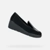 Leggero e traspirante mocassino donna con comoda zeppa, che sostiene la camminata e slancia la figura. Qui proposto in una rigorosa versione nera, ha una tomaia dal design essenziale realizzata in scamosciato e materiale effetto vernice. Con il suo look sobrio e cittadino, adatto per completare gli outfit quotidiani più o meno formali, Ilde combina stile e benessere.
