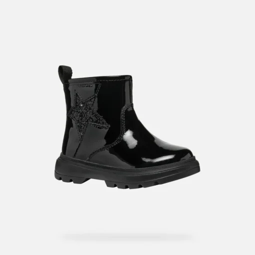 Stivaletto bimba slip-on dotato di comoda suola chunky. Con la sua tomaia alla moda qui presentata in nero con una brillante applicazione laterale a stella, Kiddartah è perfetto sia per outfit casual sia per le occasioni speciali. Realizzato in vernice e tessuto glitterato, è confortevole, leggero e traspirante.