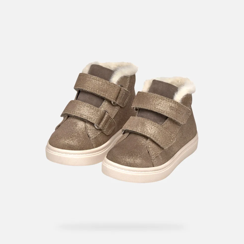 Sneaker mid-cut bimba dal design minimal e alla moda, ideale per abbinamenti casual più ricercati. In questa versione beige, Nashik sfoggia una pratica chiusura con doppio strap e dettagli in faux-fur. Realizzata in scamosciato brillante, è resistente all’acqua, traspirante e pratica da regolare.