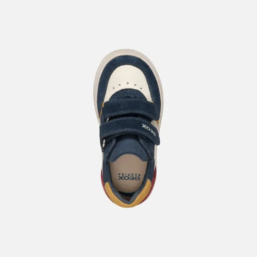 Sneaker low-cut bimbo dalle linee minimal e raffinate, ideale per abbinamenti casual più ricercati. In questa versione che abbina blu navy e beige, Nashik sfoggia una pratica chiusura con doppio strap. Realizzata in scamosciato e morbida nappa, è leggera, traspirante e alla moda.