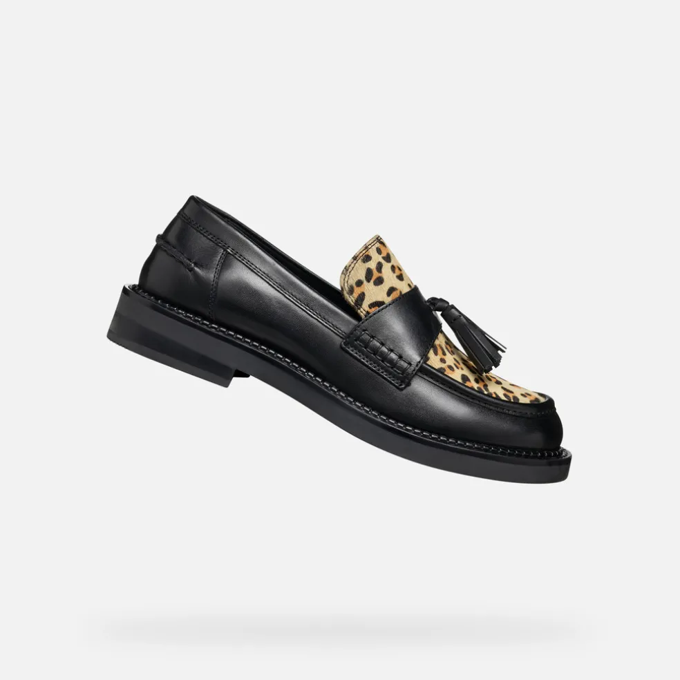 Mocassino donna con nappine dal gusto ricercato e dalle linee moderne, che offre comfort e traspirabilità. Proposto in una particolare versione che accosta nero e cognac, ha una tomaia in pelle liscia arricchita da un inserto effetto cavallino con stampa animalier. Ideale per la città, Serilda dona un twist grintoso agli outfit cittadini di tutti i giorni.