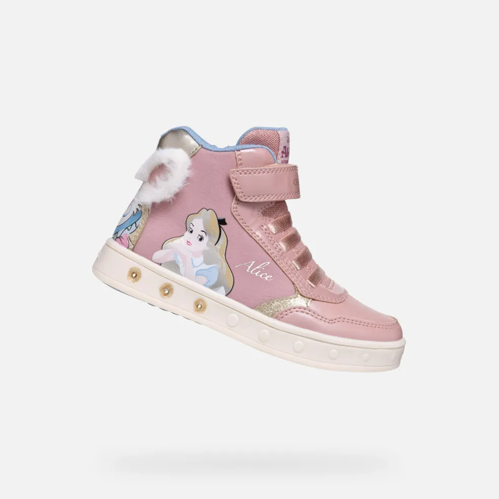 Sneaker mid-cut junior traspirante e flessibile dal moderno gusto sporty-casual, nata dalla collaborazione tra Geox e Disney. Proposta in un delicato abbinamento di rosa chiaro e platino, Skylin è caratterizzata da grafiche e applicazioni 3D dedicate alla protagonista di Alice nel paese delle meraviglie. Realizzata in tessuto e materiale effetto vernice perlata, presenta luci nella suola per regalare il massimo del divertimento.