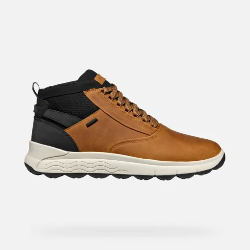 Stivaletto uomo impermeabile, che fonde attitudine sportiva e stile casual contemporaneo. Qui declinato in un’originale tonalità cognac, vanta una tomaia realizzata in pelle pull up con dettagli in tessuto a maglia. Ideale sia in città che nel tempo libero, Spherica™ 4×4 ABX garantisce dinamicità e ammortizzazione anche sotto la pioggia battente.