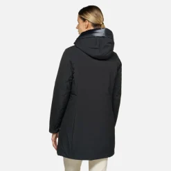 Giacca lunga donna molto confortevole e traspirante, dal look casual e moderno. Proposta in una sofisticata versione nera, Spherica™ è un capospalla ideale per la città dotato di pratico cappuccio protettivo. Perfetta anche col maltempo, è realizzata in tessuto taffetà repellente all’acqua e antivento, con dettagli in nylon lucido.