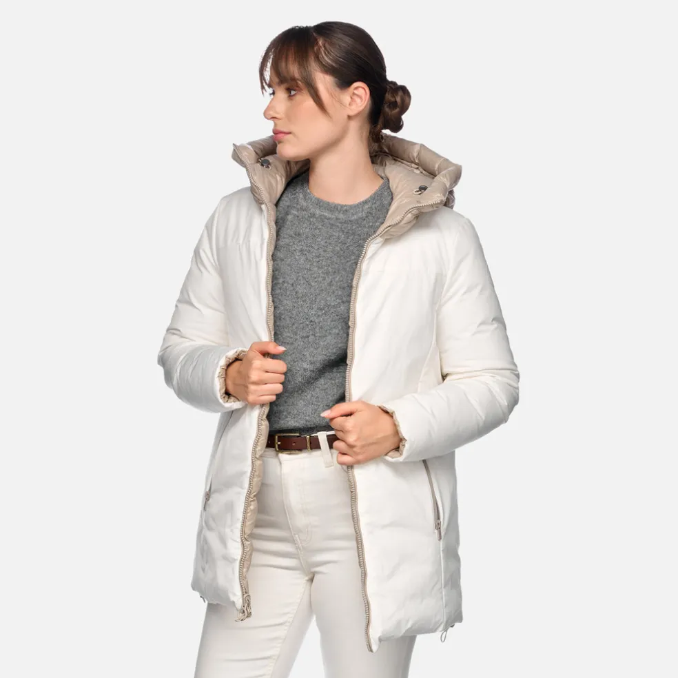 Giacca donna reversibile dal gusto contemporaneo, ideale anche per i mesi più freddi. Proposta in una versatile combinazione di bianco e grigio tortora, presenta lato esterno liscio in tessuto taffetà, lato interno e cappuccio protettivo in nylon lucido trapuntato. Calda e traspirante, Spherica™ è un capo funzionale perfetto per la città, che offre massimo comfort anche col maltempo.
