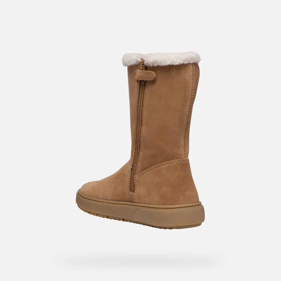 Stivale slip-on bambina caldo e di tendenza, imprescindibile nella stagione fredda. Qui declinato in una raffinata tonalità cognac, Theleven si abbina con facilità agli outfit della scuola o del weekend. Realizzato in morbido scamosciato con dettagli in faux-fur, è resistente all’acqua e offre protezione e comfort per tutta la giornata.