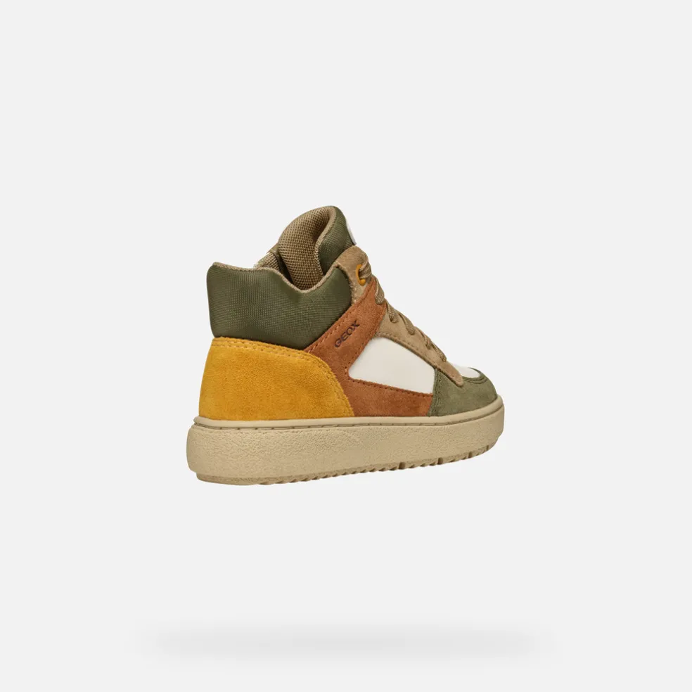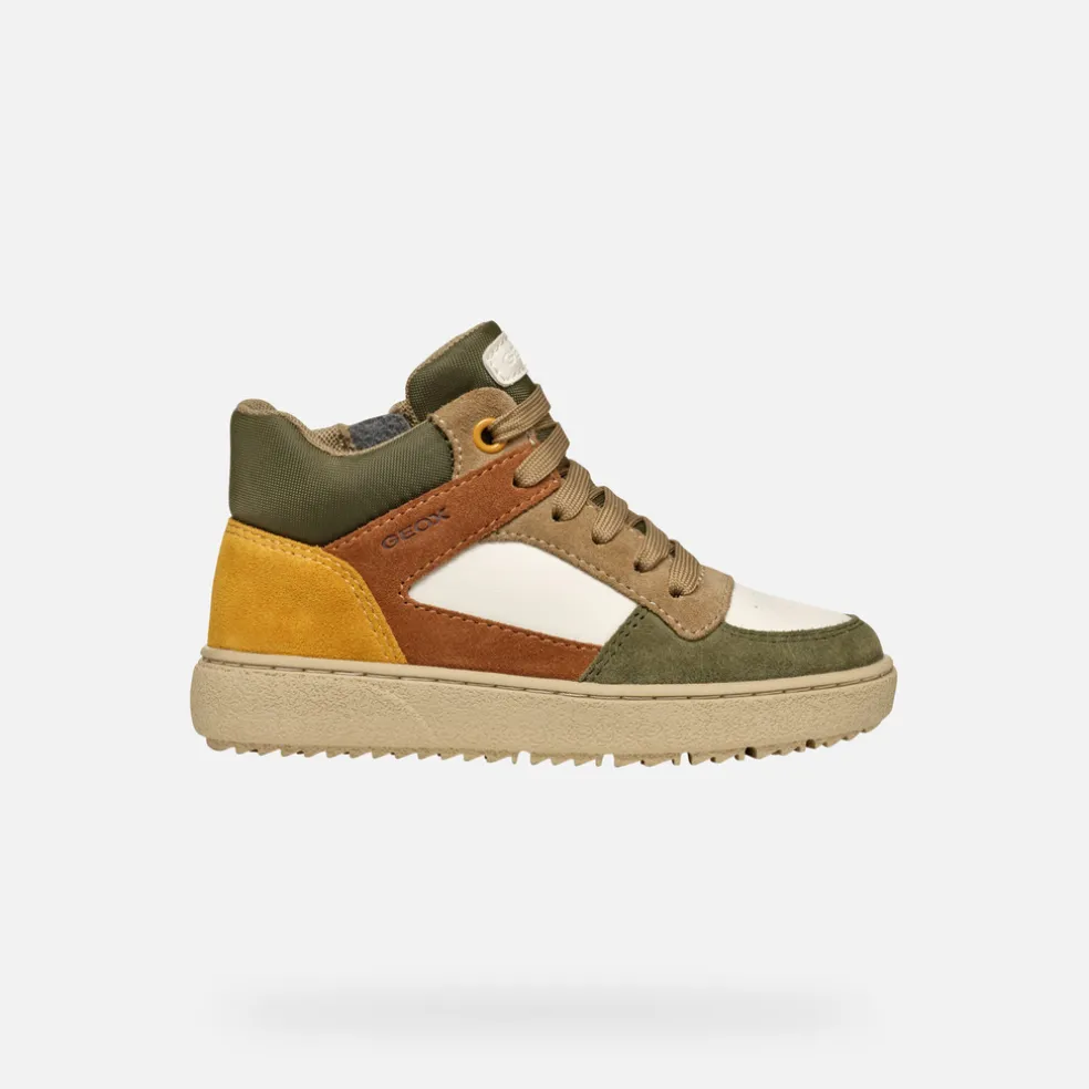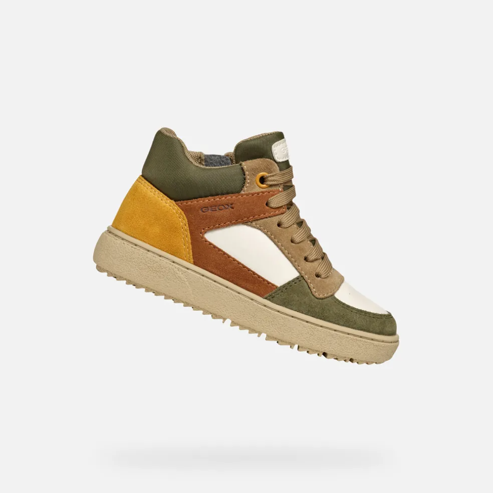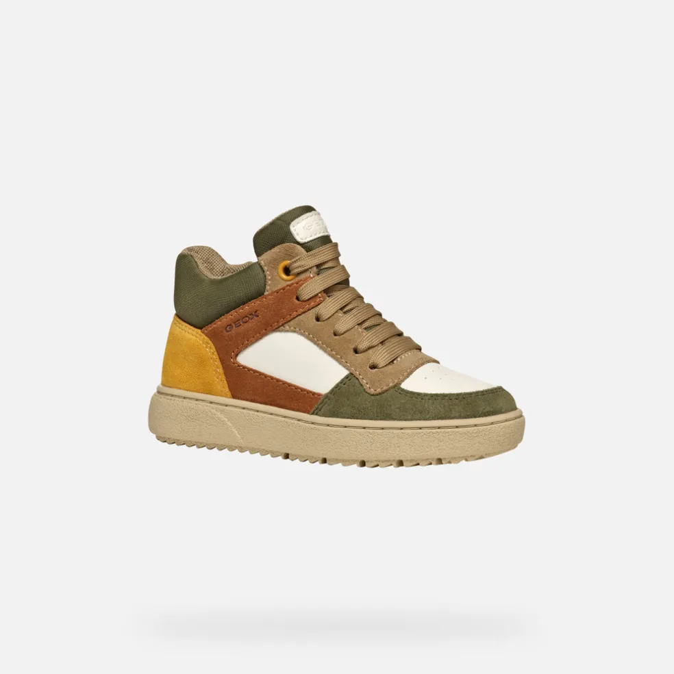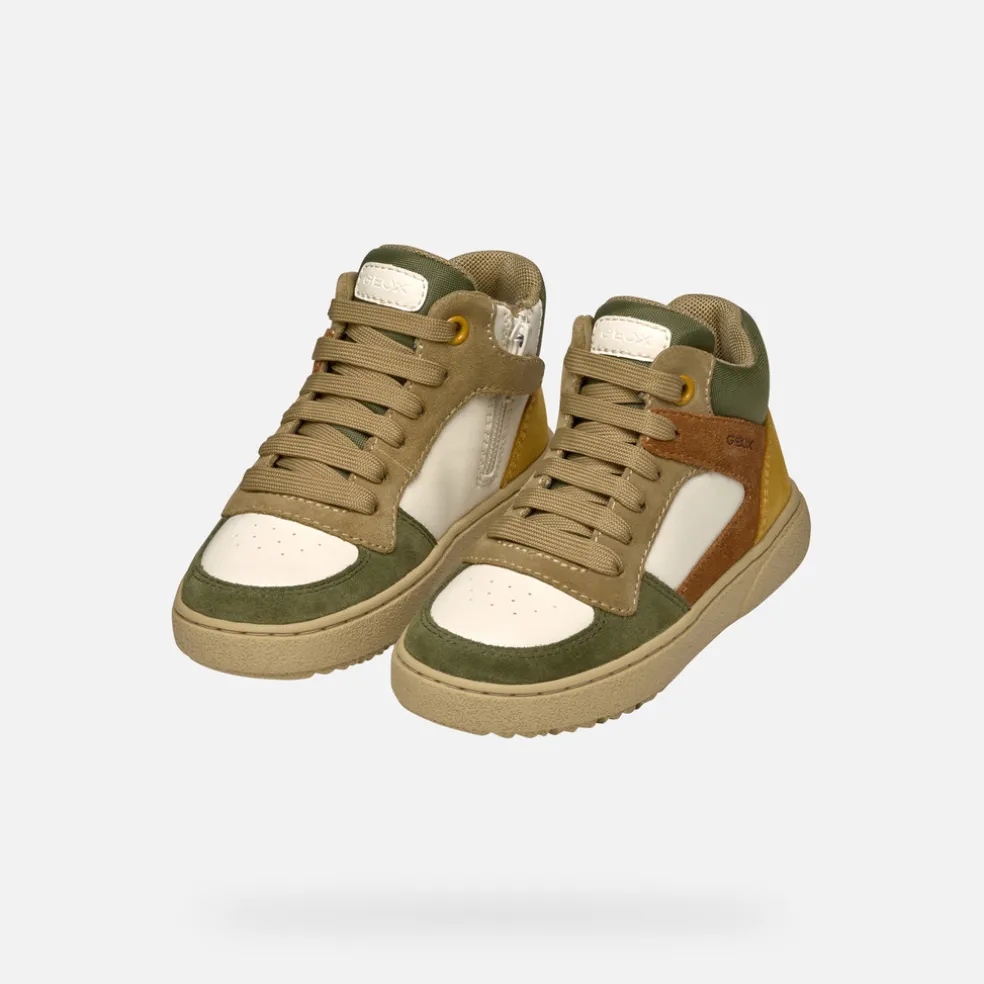 Sneaker mid-cut bambino leggera e traspirante, dallo stile casual ricercato. In questa versione che mixa bianco e verde scuro, Theleven sfoggia un design dal forte appeal cittadino. Realizzata in materiale effetto pelle e scamosciato, aggiunge un tocco trendy anche ai look più sportivi.