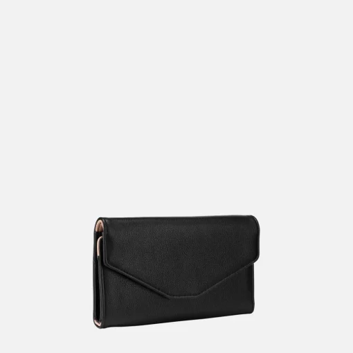 Portadocumenti a libro donna dal design moderno e funzionale, ideale anche in viaggio. Qui nella classica versione nera, è realizzato in materiale effetto pelle bottalata. Dotato di diversi scomparti, tra cui uno porta biglietto aereo e uno porta penna, è un accessorio pratico e alla moda.Chiusura con bottone automatico.Una tasca portamonete.Sei portatessere.Un porta biglietto aereo e un portapenna.Un anello portachiavi.Dimensioni: L 19 cm x W 2 cm x H 11 cm.