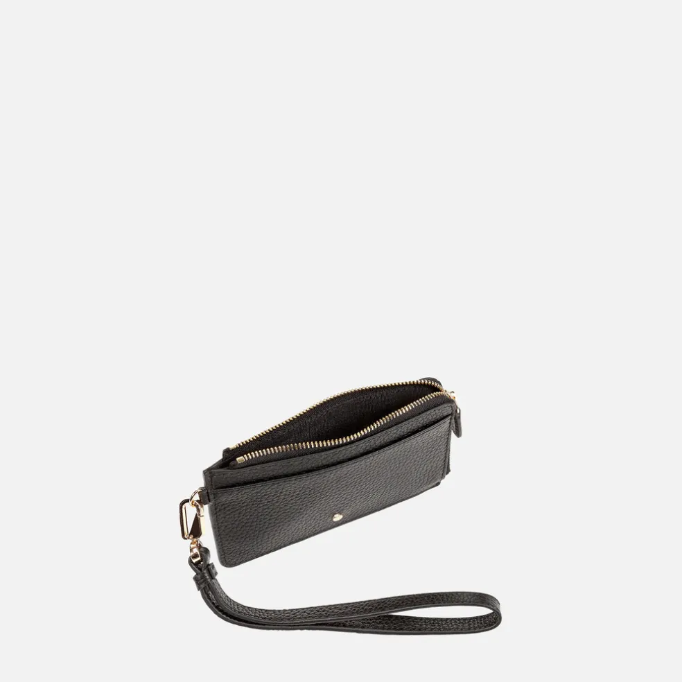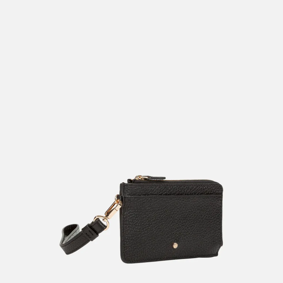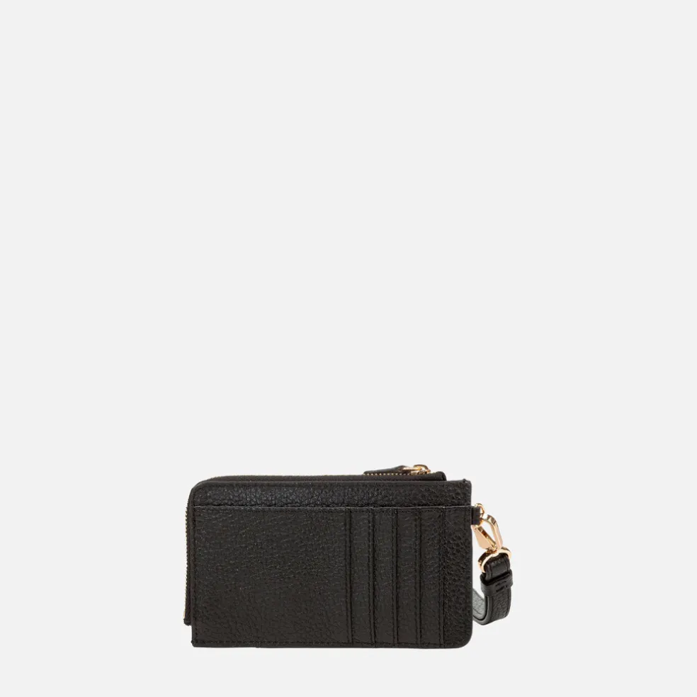 Pratico portafoglio donna dal design moderno e compatto e dallo spessore ridotto. Realizzato in resistente pelle bottalata per un look impeccabile, è qui presentato in una sobria ed intramontabile versione nera. Indispensabile compagno quotidiano, da portare con sé anche in viaggio, è dotato di chiusura con zip laterale e di comode fessure portatessere.Chiusura con zip.Loop removibile.Cinque portatessere verticali.Un portacarte anteriore e uno posteriore.Accessori metallici con finitura oro.Dimensioni: L 14,5 cm x W 1,5 cm x H 8,5 cm.