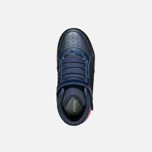 Sneaker mid-cut junior dinamica e confortevole, che richiama i modelli vintage da basket. In questa variante blu navy, Washiba completa con una nota trendy i look più sportivi. Realizzata in materiale effetto pelle perlata e materiale effetto vernice, è ideale sia per la scuola che per le attività del tempo libero.