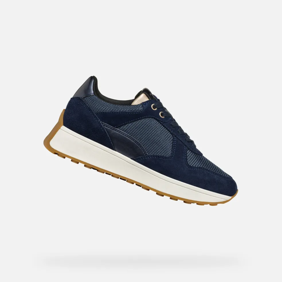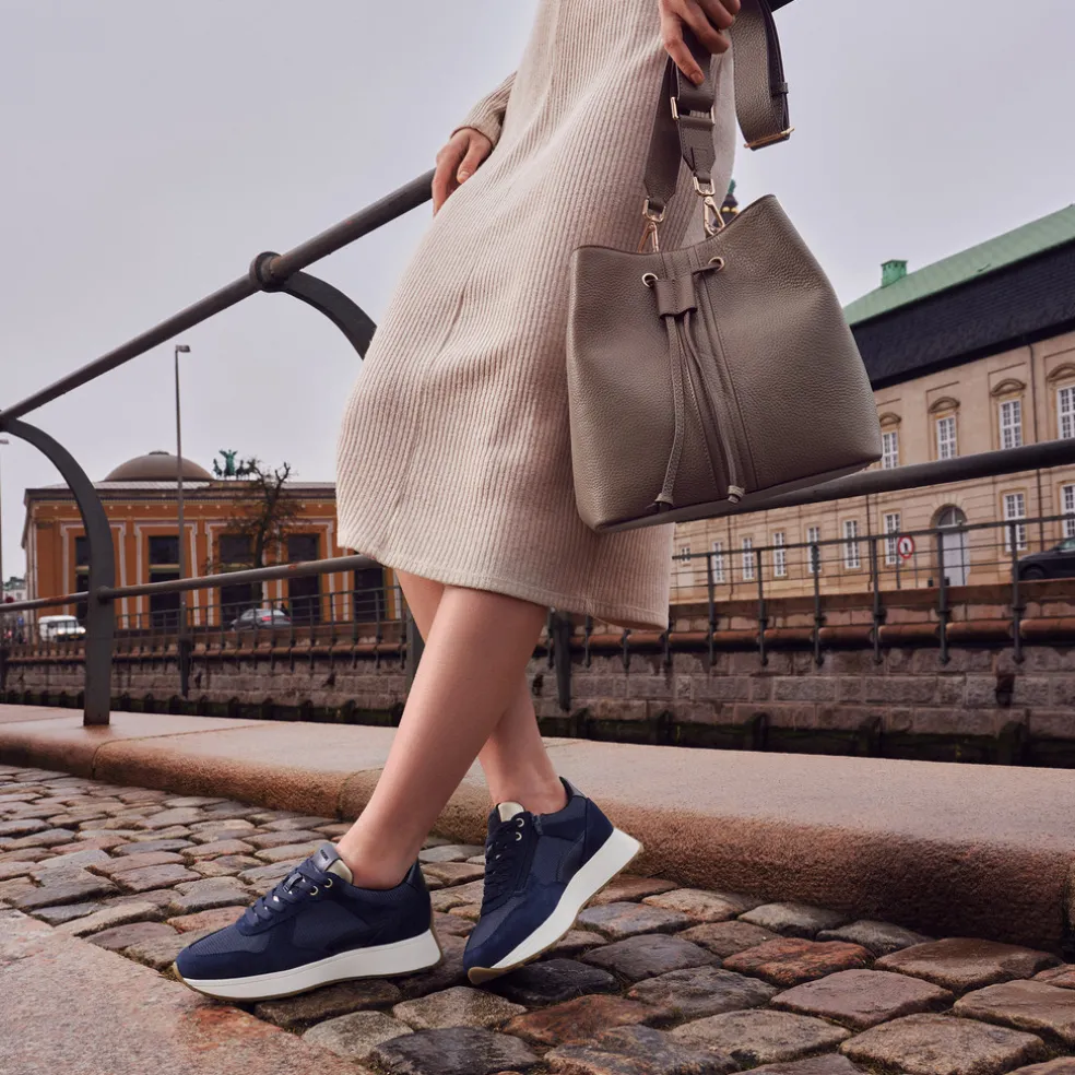 Sneaker donna dal design di ispirazione retro-running e dal dna contemporaneo. Proposta in un mix di tessuto brillante e scamosciato, è qui declinata in una particolare versione che accosta denim scuro e blu navy. Sportiva ma ricercata, Amabel aggiunge una nota sporty-chic ai casual look di tutti i giorni.