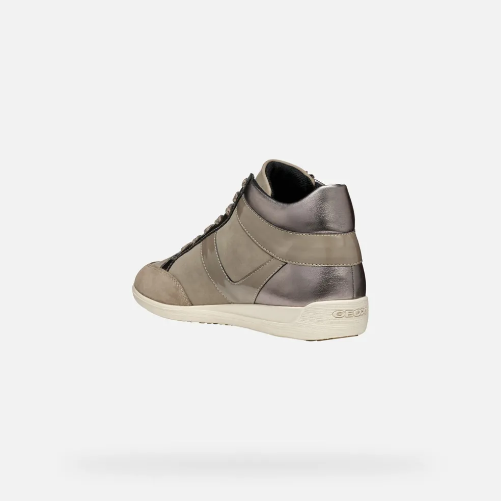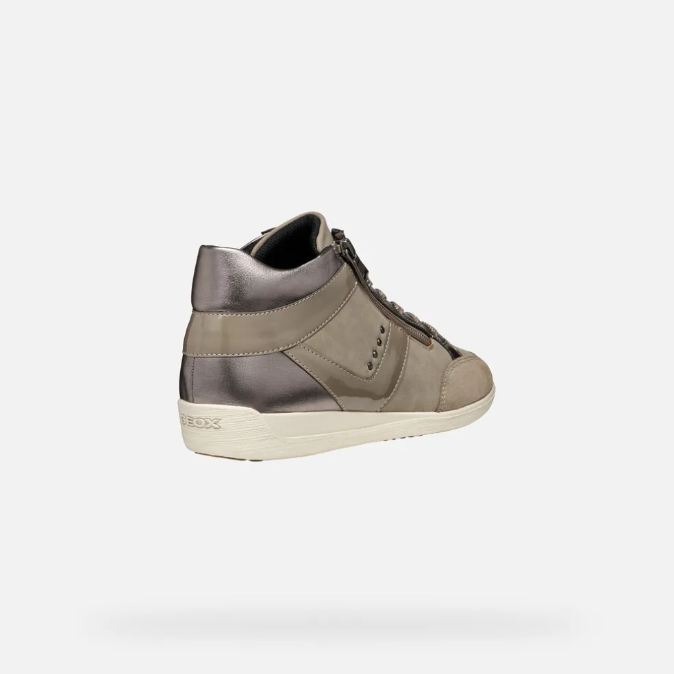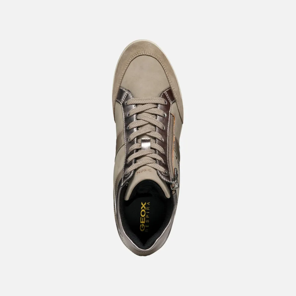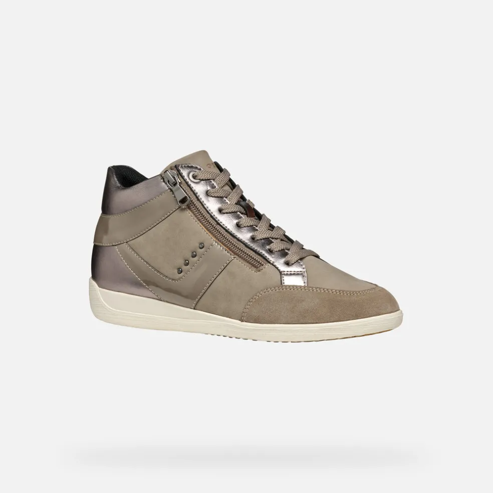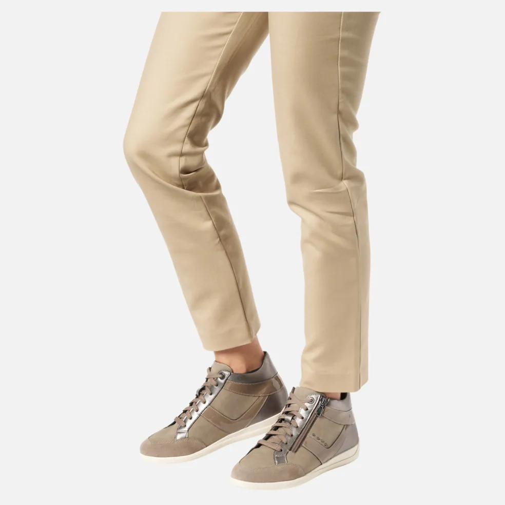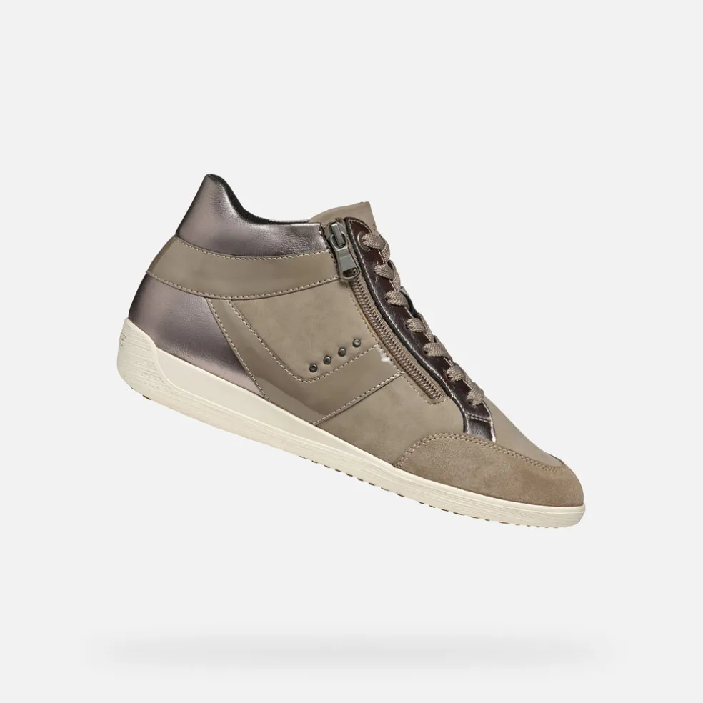 Sneaker mid-cut donna con pratica zip laterale dal look casual e moderno, perfetta per la vita in città. Confortevole e traspirante, vanta una tomaia in materiale effetto nabuk e materiale effetto vernice ed è qui declinata in una ricercata tonalità taupe. Leggera e facile da calzare, Myria è una scarpa sportiva e assolutamente quotidiana, che aggiunge un tocco speciale agli abbinamenti informali.