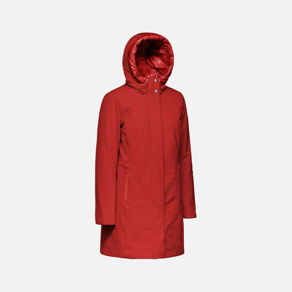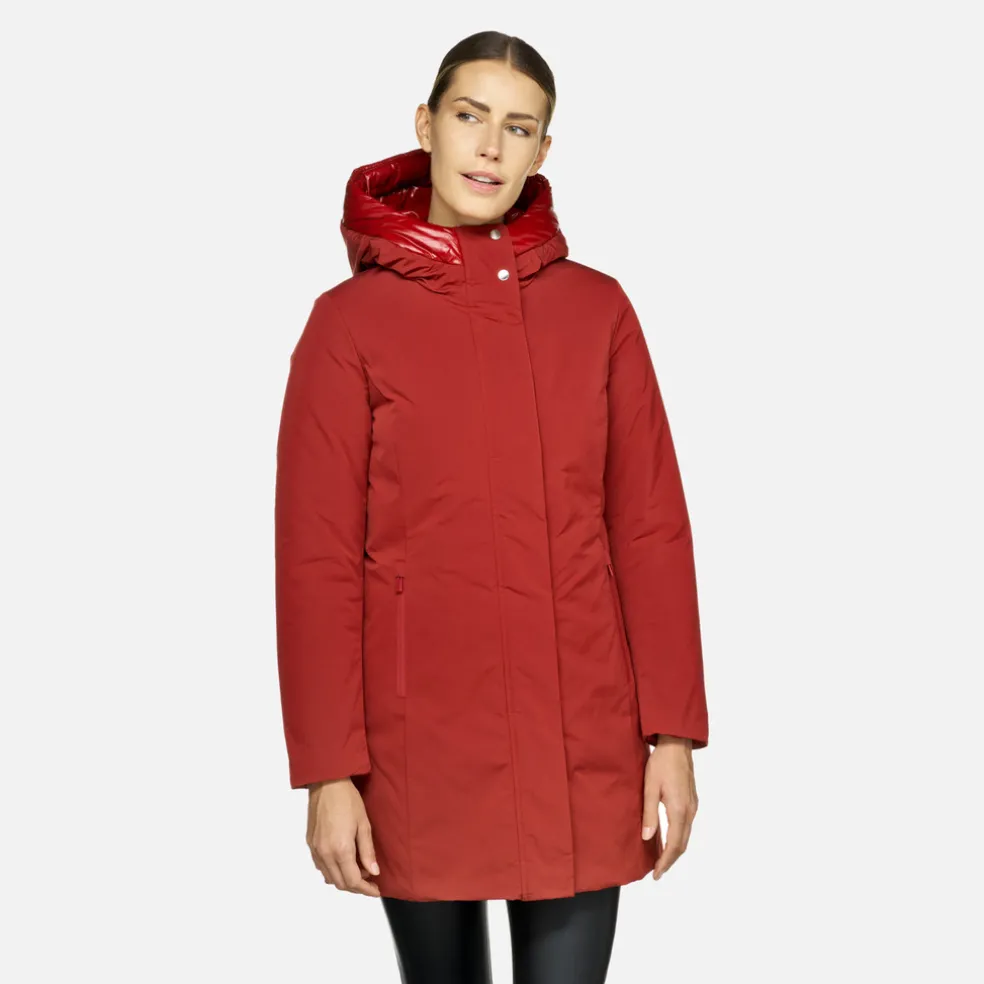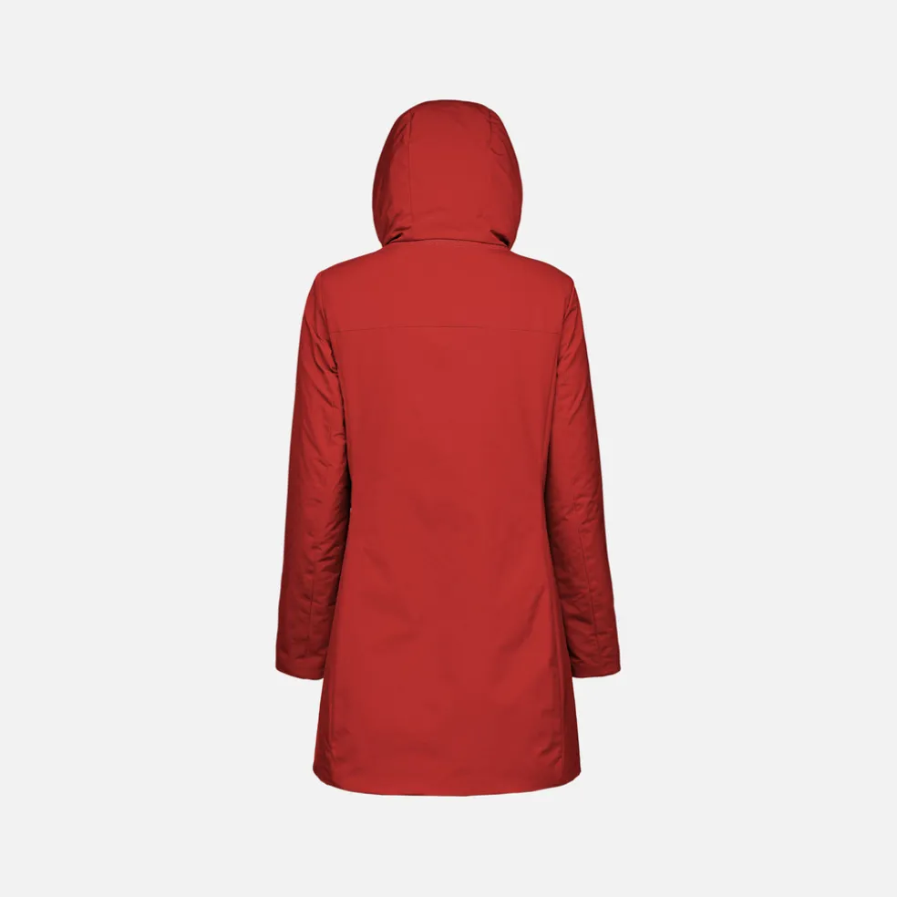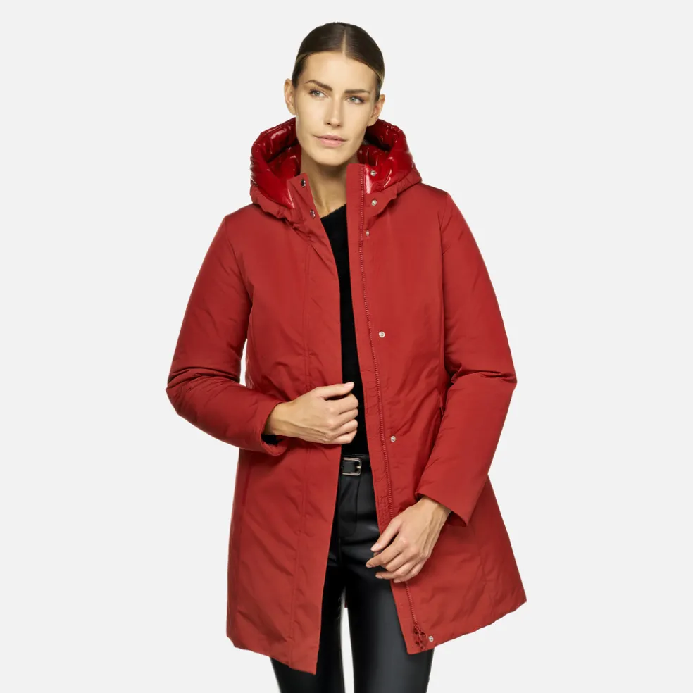Giacca lunga donna molto confortevole e traspirante, dal look casual e moderno. Proposta in un’affascinante versione rosso scuro, Spherica™ è un capospalla ideale per la città dotato di pratico cappuccio protettivo. Perfetta anche col maltempo, è realizzata in tessuto taffetà repellente all’acqua e antivento, con dettagli in nylon lucido.